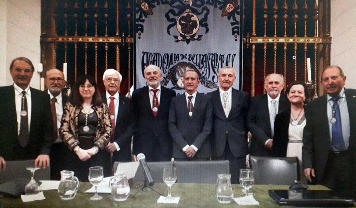 Toma de posesión del último académico, Ilmo. Sr. Sánchez-Saus acompañado por el cuerpo de académicos y el presidente de la Academia don Luis Garrido Quijano.